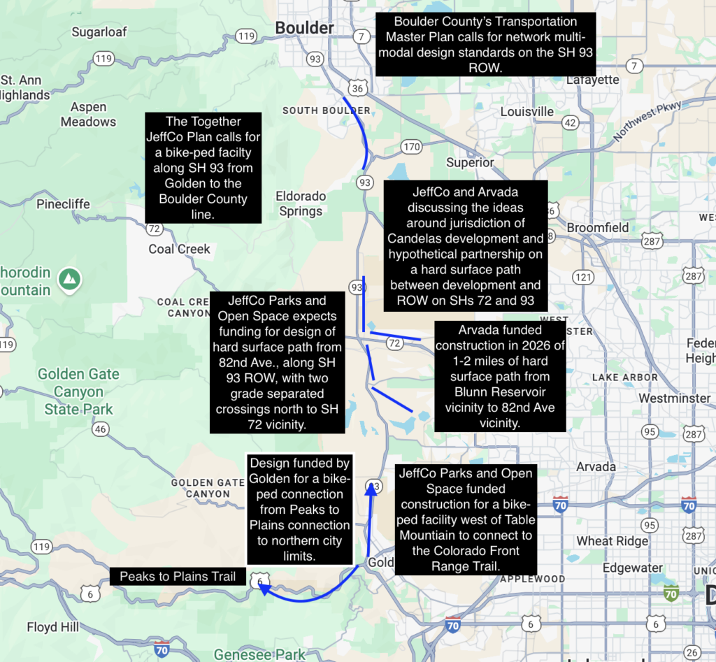 For years, I (Matt) have tried and failed to propose a hard surface bikeway between Golden and Boulder along or in the Colorado 93 right-of-way. There are lots of reasons this is not a great idea. And, its connectivity potential, its shared funding potential spread among two counties and three cities, and its design potential with rail and bus and bike-ped all together are reasons it would be worthwhile.
