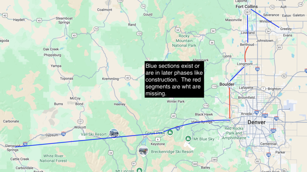 Rudimentary to be sure, this map, nonetheless, shows how Colorado 93 is a crucial connection to larger bikeway/path work on a statewide scale. At $500,000,000 to build, the Clear Creek Trail is great…if you can get to it.